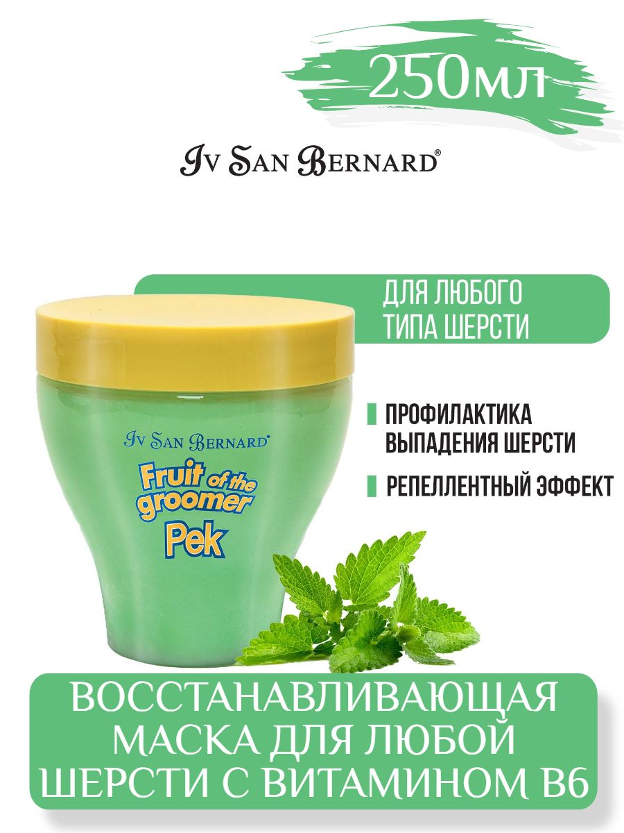 Восстанавливающая маска Iv San Bernard Fruit of the Groomer Mint для любого вида шерсти с витамином В6 250 млМаска разработана для любого типа шерсти собак и кошек. Освежает, обновляет, оживляет, питает, увлажняет и тонизирует шерсть и кожу. Оставляет шерсть ухоженной и блестящей.Способ применения: на чистую вымытую влажную шерсть нанести массирующими движениями, оставить на 5-10 мин., смыть водой, высушить шерсть.Разработано для профессионального применения.Средство прошло микробиологическое тестирование. Не глотать, хранить в местах, недоступных детям.